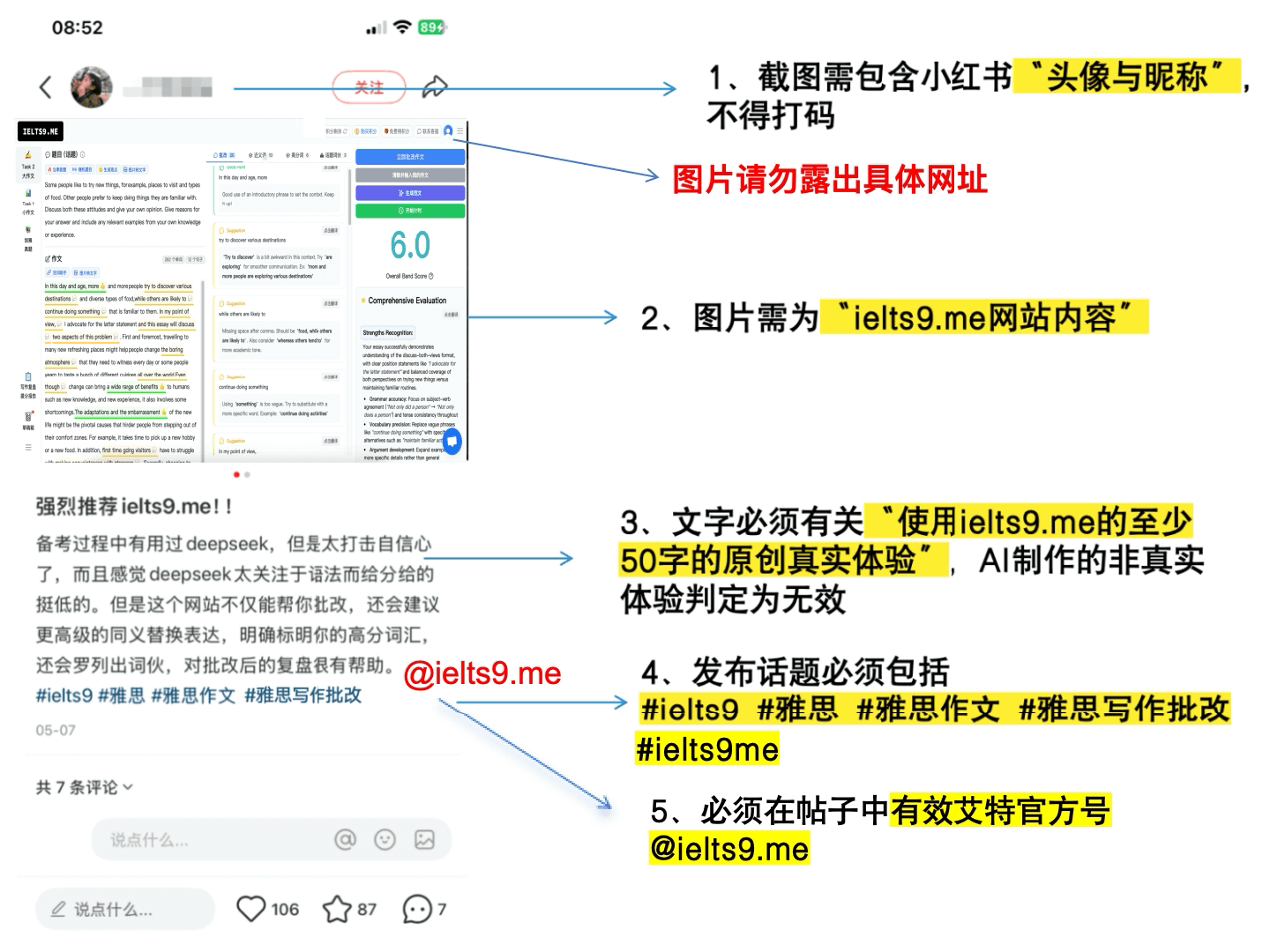 - 话题: 发布的#话题需有效,话题的颜色必须是蓝色,发布后才会被平台收录。话题需包含 #ielts9 #雅思 #雅思作文 #雅思写作批改 #ielts9me 等