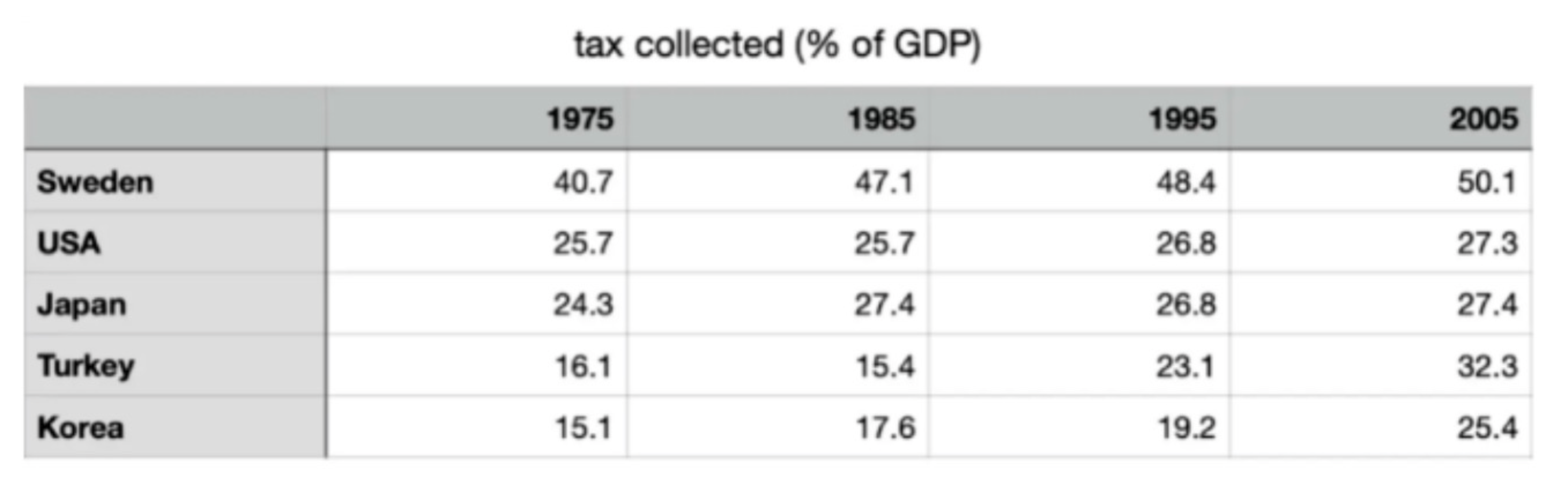 图表内容: 瑞典的税收率一直最高,在 30 年间从 40.7%上升到 GDP 的 50.1%。美国和日本维持相对稳定的税率,约为 25-27%。土耳其和韩国显示显著增长,土耳其从 16.1%跃升至 32.3%,韩国从 15.1%增至 25.4%。到 2005 年,除瑞典外,所有国家的税率都趋同于 GDP 的 25-32%之间,表明这些多样化经济体的税收负担趋向更为相似。